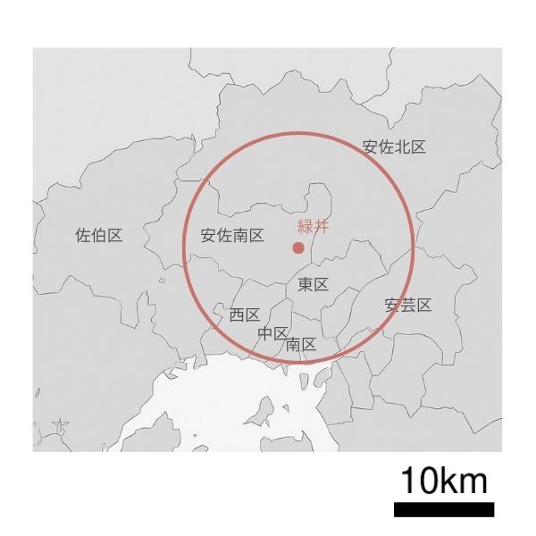 安佐南区緑井を中心に半径12km程度です。
